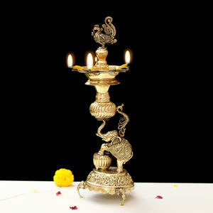 Trendia Decor presents a captivating Oil Lamp, a cultural masterpiece from India. Crafted from premium brass with intricate detailing and a stunning golden finish, it beautifully blends tradition with contemporary elegance. The lamp features a peacock-adorned top for ghee or oil and an elephant base symbolizing grace and strength. Illuminate your space and celebrate India's artistic legacy with this extraordinary lamp.