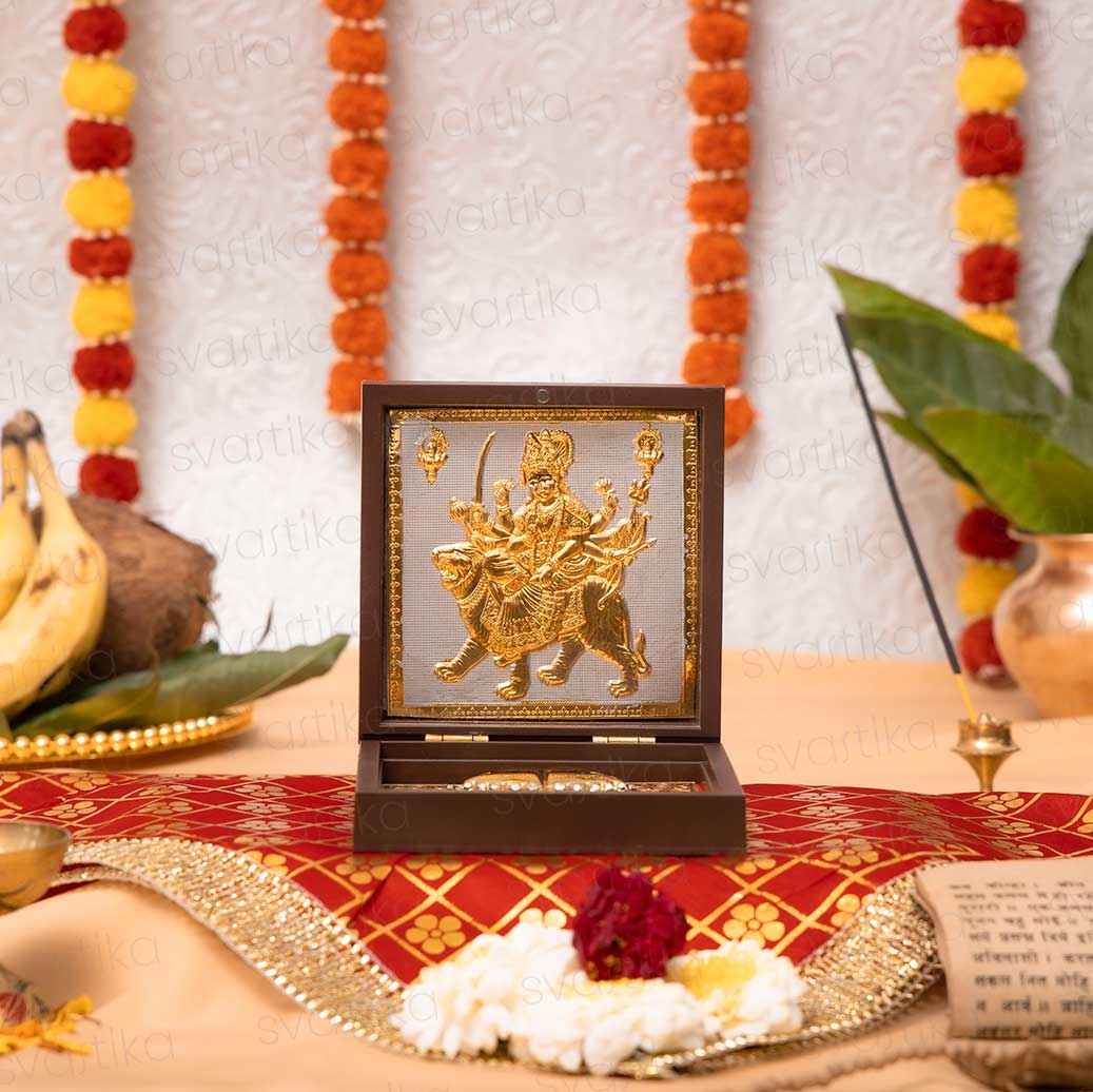 Let Adishakti bless you and your family in all her nine divine forms with the Nav Durga 24 Karat Gold & Silver Plated with beautiful Charan Paduka in Box. Maa Durga (Sheerawali Mata) is often associated with protection, strength, motherhood and keeping this material world in order and decorum.