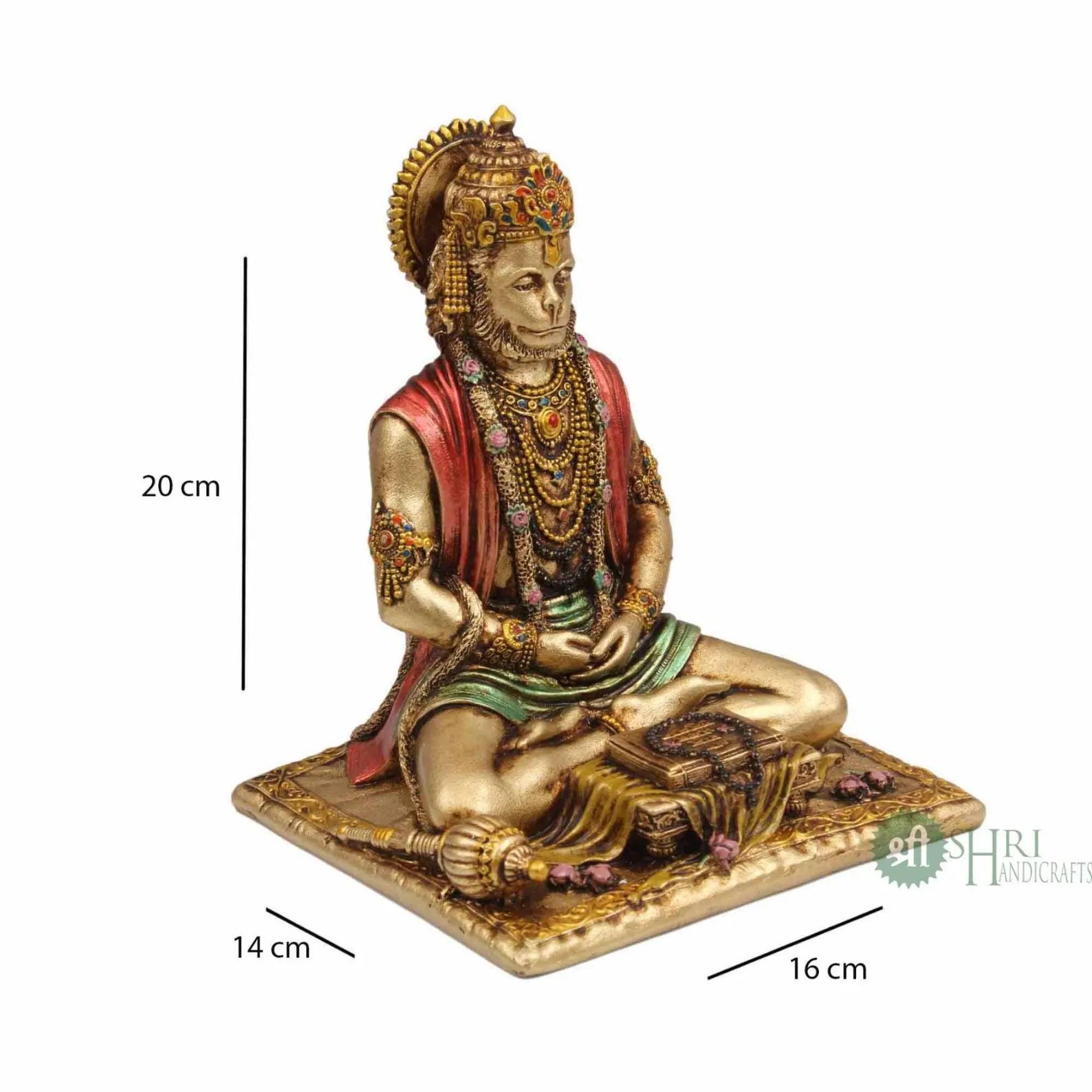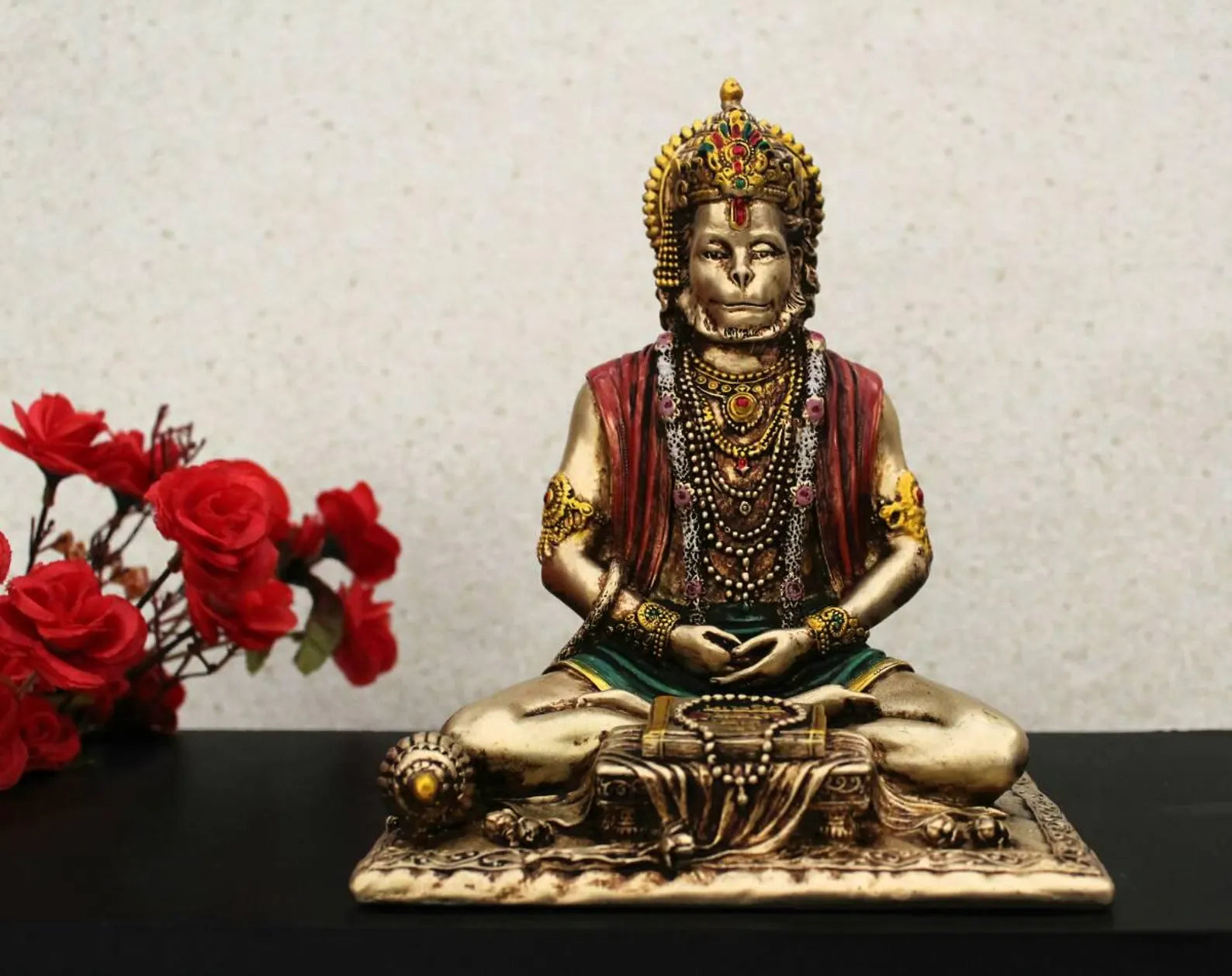 Trendia brings to you a remarkable Hanuman Ji idol made of resin, seated in meditation. The Hanuman showpiece boasts intricate detailing and hand-painted colored accents on a rustic golden surface, creating an aura of divinity and tranquility. More than just a showpiece, this Hanuman idol embodies strength, devotion, and spirituality, making it a treasured addition to your sacred space, a symbol of unwavering faith and blessings.