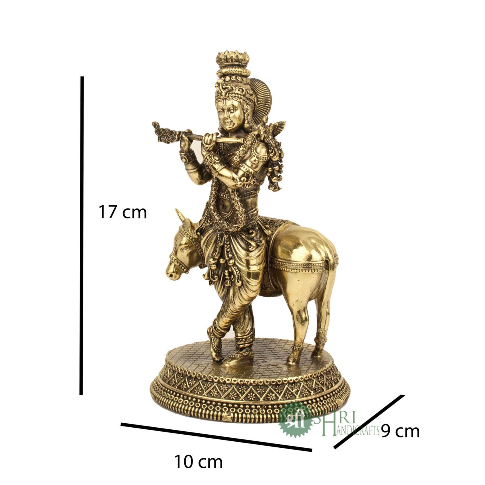 Meticulously handcrafted in solid brass, the idol showcases intricate detailing—from Krishna’s ornate attire and flute to the gentle expression of the cow and the richly patterned base. The antique brass finish enhances its traditional appeal, making it a striking centerpiece for both worship and décor.
