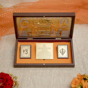 As you open this priceless Pocket Temple, you have this alluring imprint of the Golden Temple that is covered with 24 Karat Gold. On the other side you have 3 small mementos that encompass spiritual teaching of the Sikh community.