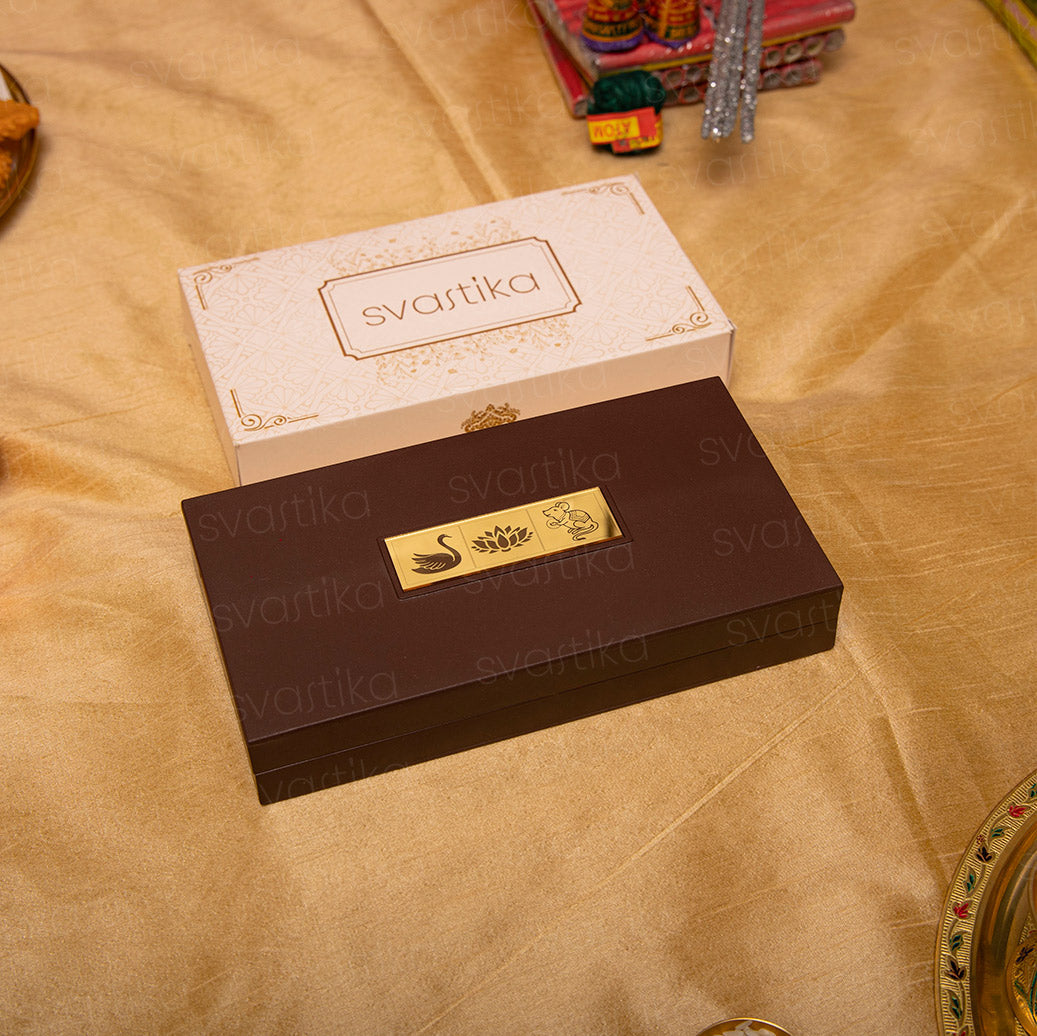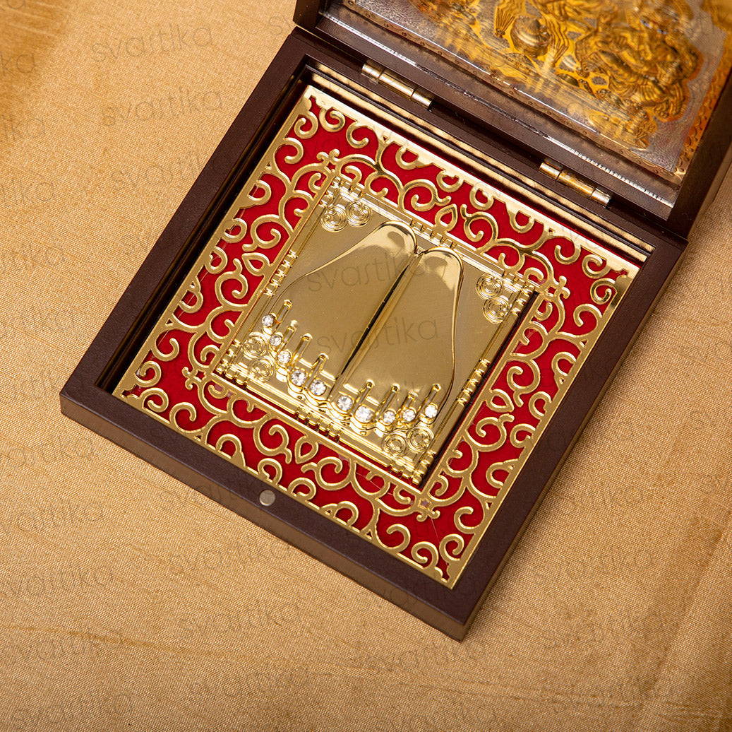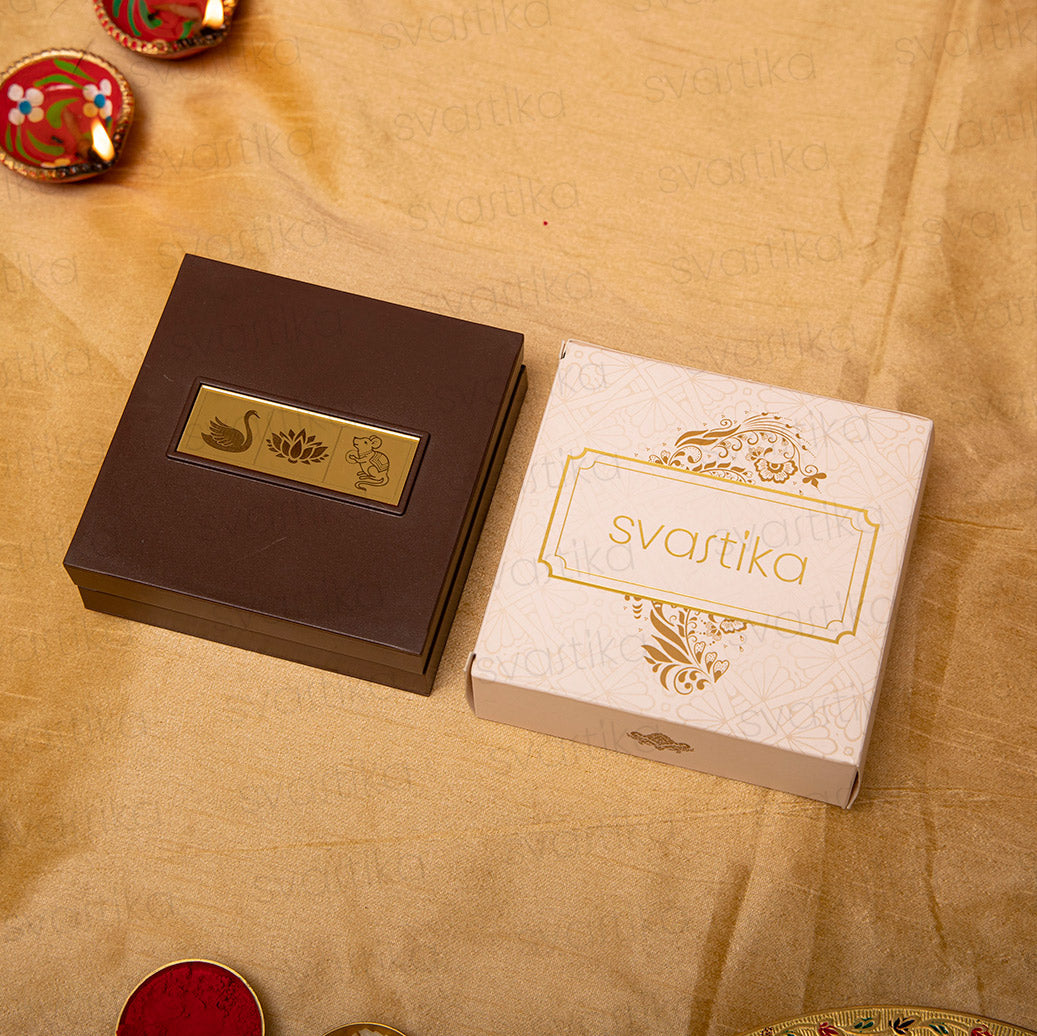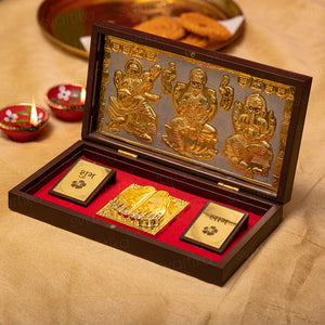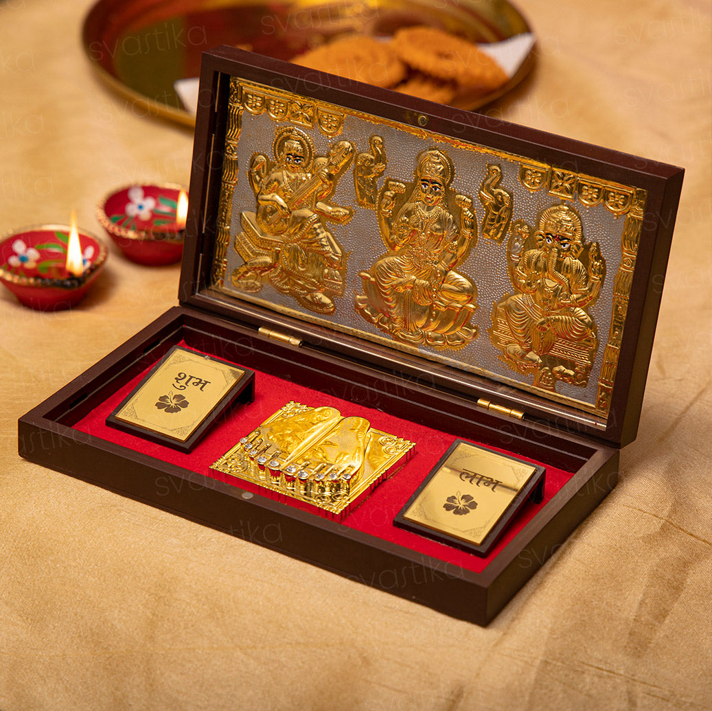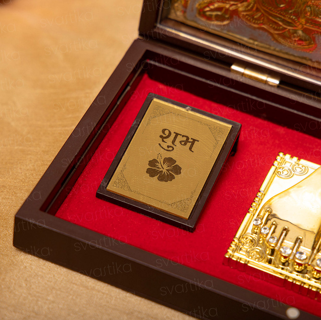 Engraved on the top half of the box and plated in 24 Karat Gold, these divine idols bring blessings of knowledge, wealth, and prosperity. The temple also includes a gold foil-wrapped "Shubh Labh" message to protect your home from evil.