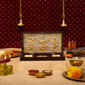 Elevate your home's positive vibes with our exquisite wooden pocket temple. Crafted with a beautiful wood finish and wrapped in pure 24 Karat Gold, it features the revered deities Saraswati, Laxmi, and Ganesha.