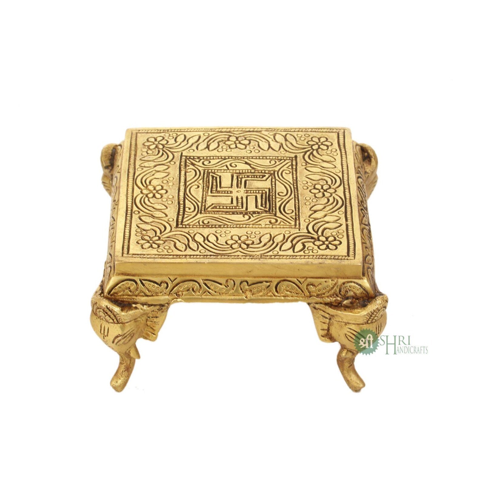 Made from premium-quality brass with a rich traditional finish, this sturdy chowki showcases intricate floral and vine detailing along the top and sides. The four carved legs provide excellent stability while adding a royal, temple-inspired aesthetic.