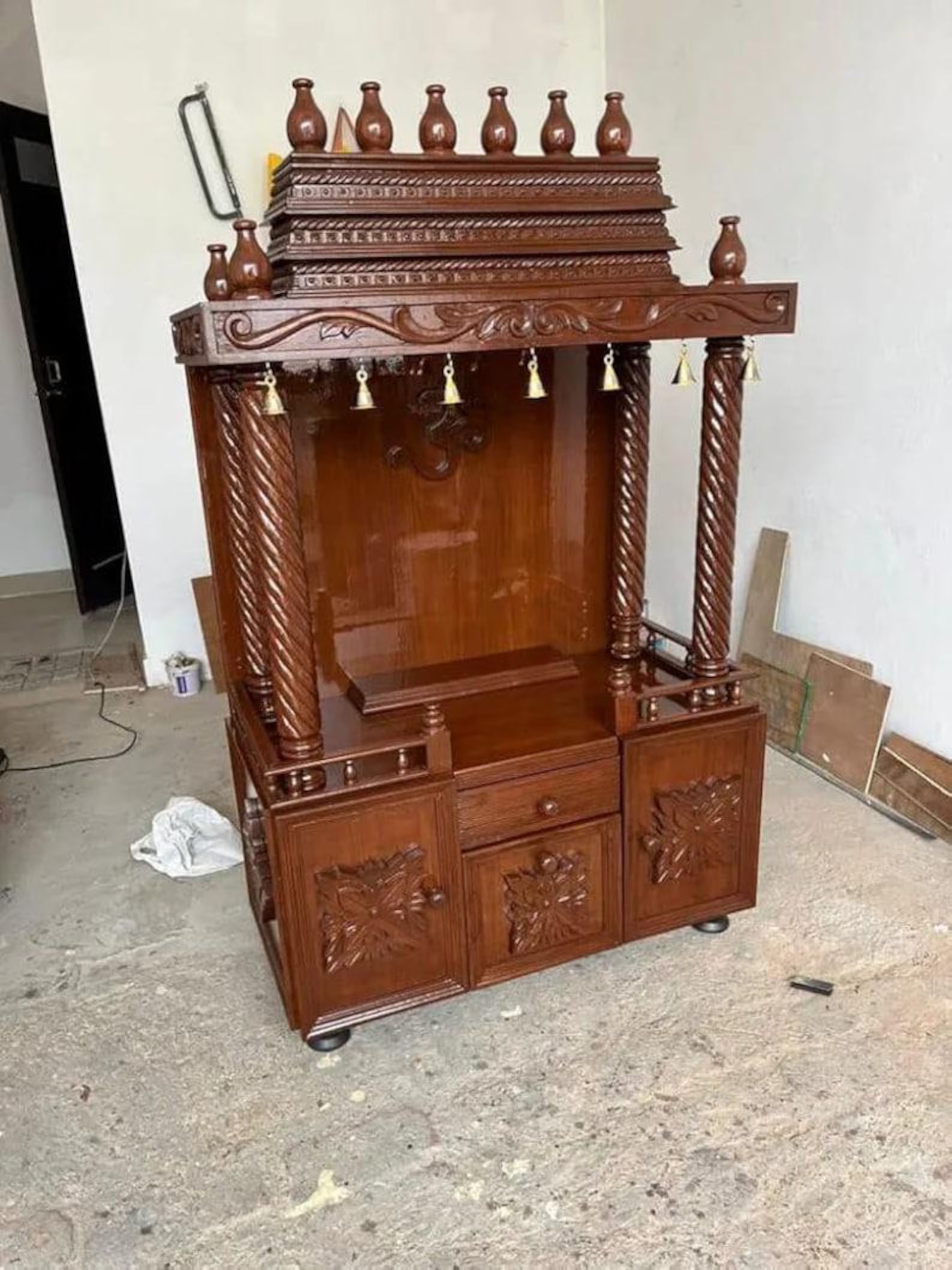 his wooden temple is made up of Solid Teakwood. I made this temple with my own hands. All carving on temple is handcrafted by me. I always try to make Beautiful design for my buyers please contact us for any query. Thanks